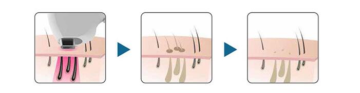 Using thermal damage theory, the abundant melanin absorbs laser energy and the temperature rises rapidly, under this situation the hair follicle and hair shaft are damaged by thermal. At the same time, the oxygen supplying tissue surrounding the hair follicle’s stem cells is destroyed by the spreading heat energy. Thus hair regrowth is stopped permanently.